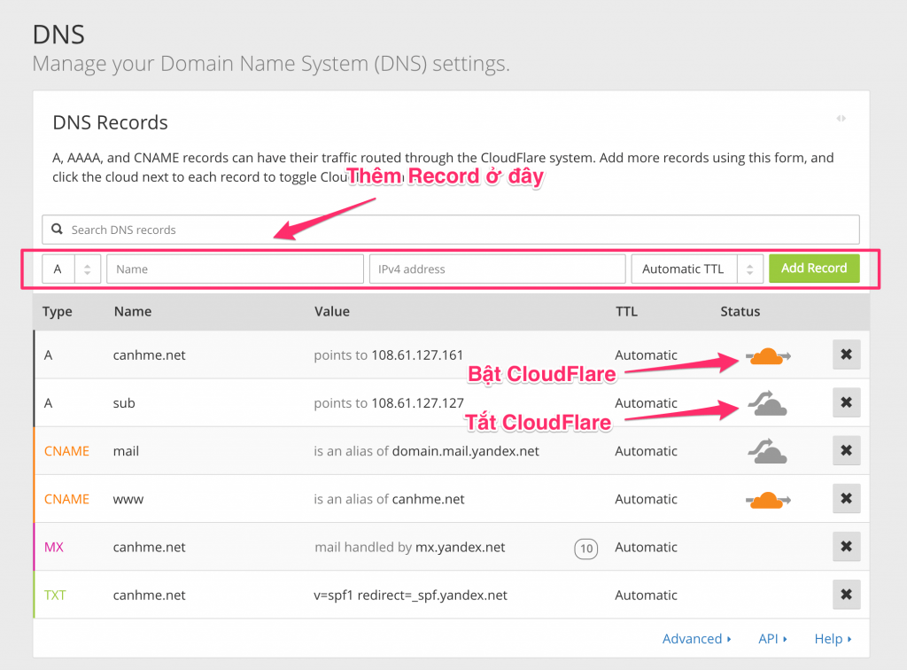Đây là thao tác quan trọng nhất khi sử dụng CloudFlare bạn phải nắm vững.