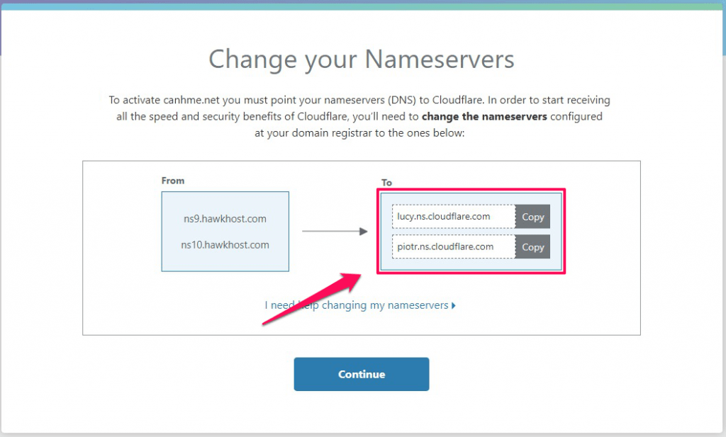 Cuối cùng, CloudFlare cung cấp 2 bản ghi Name servers, hãy trỏ tên miền về Name servers mới này. Nhấn Continue để hoàn tất.