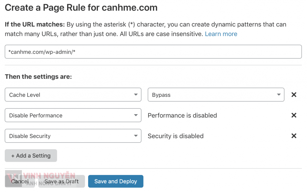 Nhấn Create Page Rules, URL bạn điền *canhme.com/wp-admin/*, thay canhme.com bằng địa chỉ của bạn. Setting chọn Cache Level rồi Bypass. Tiếp theo chọn Disable Performance và Disable Security như bên dưới, nhấn Save and Deploy là xong.