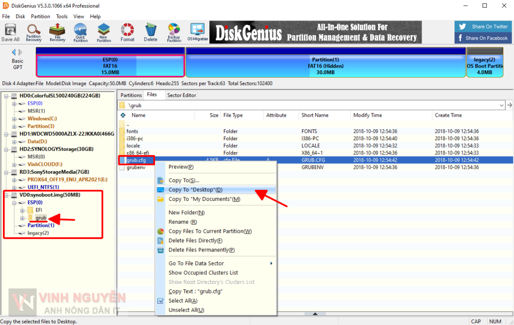 - Trong ổ ảo synoboot.img => ESP => grub => Copy file grub.cfg ra Desktop (mà ra đâu cũng được, tùy bạn ).