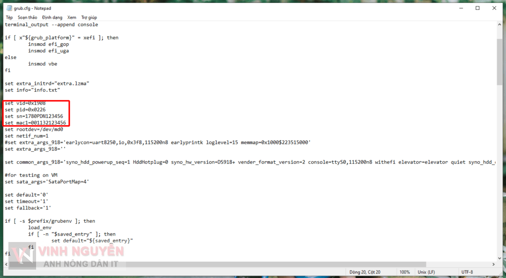 - Mở file grub.cfg bằng ứng dụng Notepad (dùng ứng dụng nào cũng đc miễn là cho chỉnh sửa file dạng text). Bạn để ý đến mấy dòng mình khoanh đỏ.